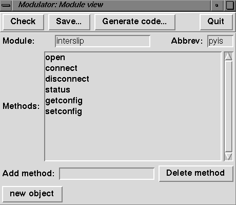 The method we describe in this document, using Modulator, is the best method for small interfaces. For large interfaces there is another tool, Bgen, which actually generates the complete module without you lifting a single finger. Bgen, however, has the disadvantage of having a very steep learning curve, so an example using it will have to wait until another document, when I have more time.